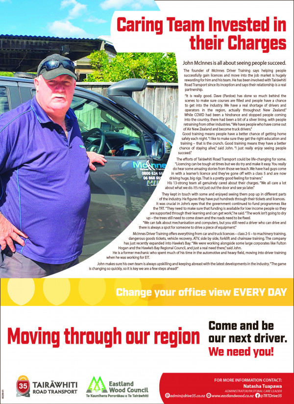A recent feature published in the Gisborne Herald acknowledges the leadership and support provided by John McInnes Driver Training, in conjunction with The Tairawhiti Road Transport Programme (TRTP).